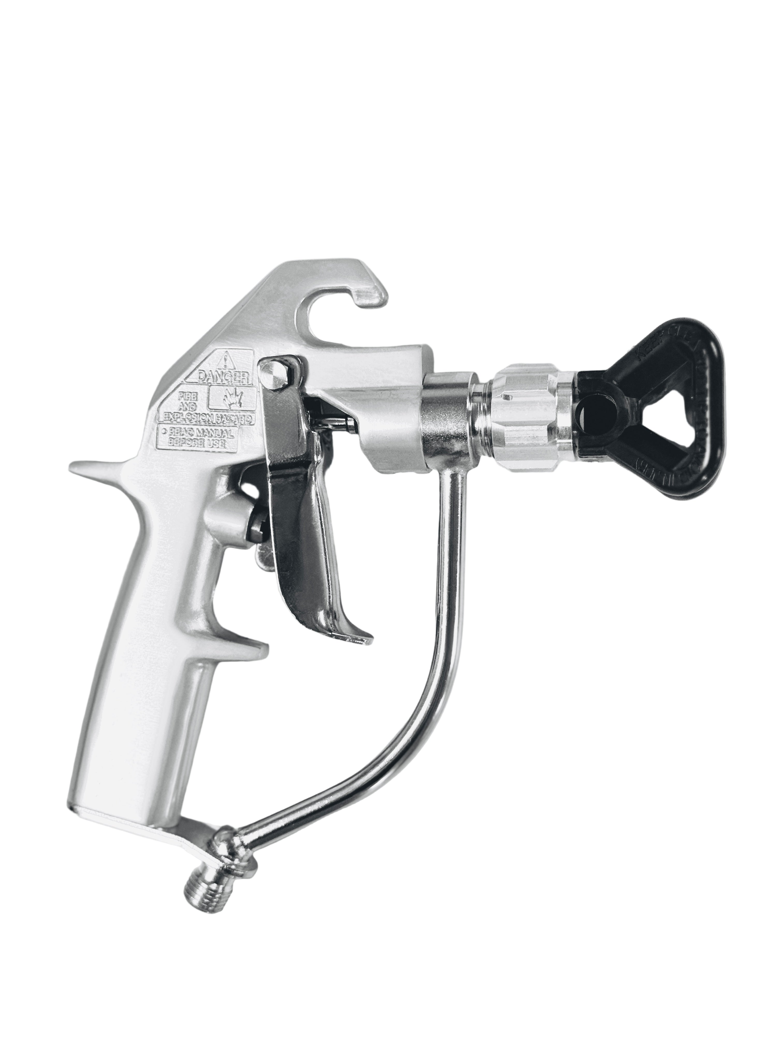 The gun features a factory-set needle design, eliminating the need for adjustments and providing long-lasting reliability. The ergonomic two-finger trigger enhances control and reduces fatigue during long spraying sessions, while the airless flat spray pattern ensures even coverage on large, flat surfaces.